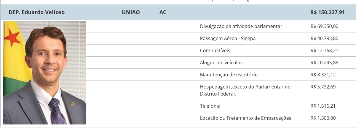 O que menos gastou entre os 8 deputados, foi o Deputado Eduardo Velloso,